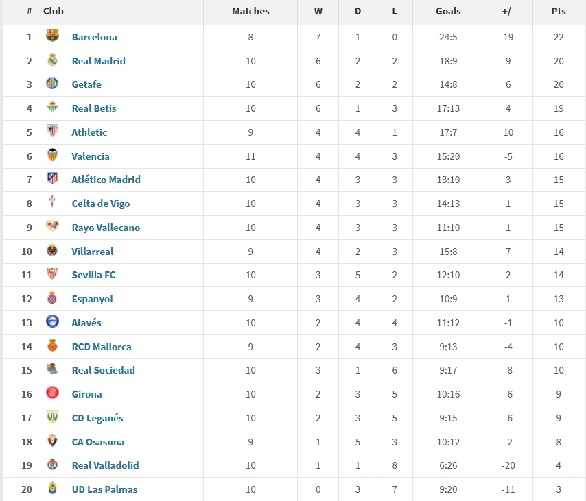 皇馬6勝2平2負(fù)積20分第二。馬競僅取得4勝3平3負(fù)積15分,位居第7。