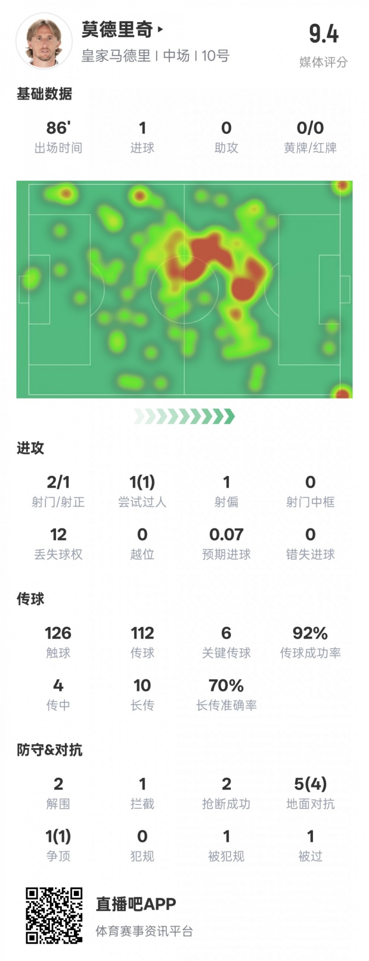 莫德里奇本場比賽具體數(shù)據(jù)如下: