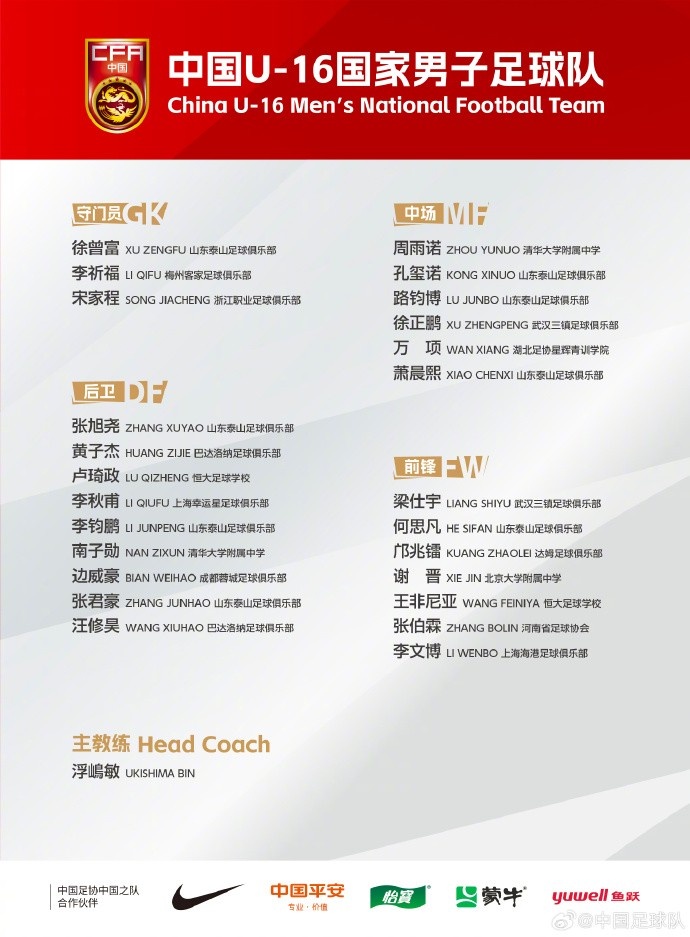 U16國足集訓名單:梁仕宇、萬項、鄺兆鐳在列,泰山8人