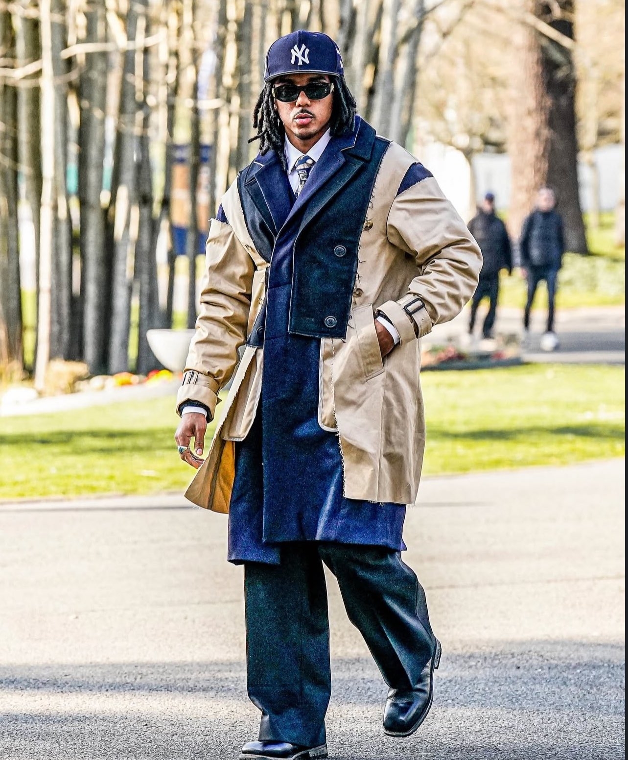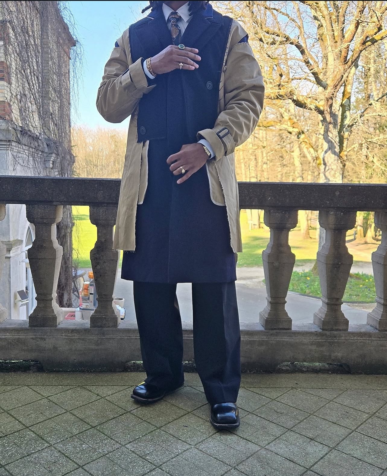 這一次孔德的穿搭中,最引人注目的就是他身上的拼接外套,這件大衣來(lái)自日本小眾設(shè)計(jì)師品牌FACETASM,是2022-23的秋冬系列中的一件。