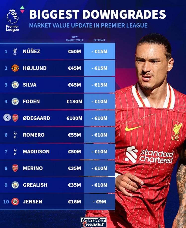 3月19日訊 《轉(zhuǎn)會(huì)市場(chǎng)》更新了英超球員身價(jià),并列出了本期球員身價(jià)下降榜單,曼城3將、阿森納熱刺各2人。