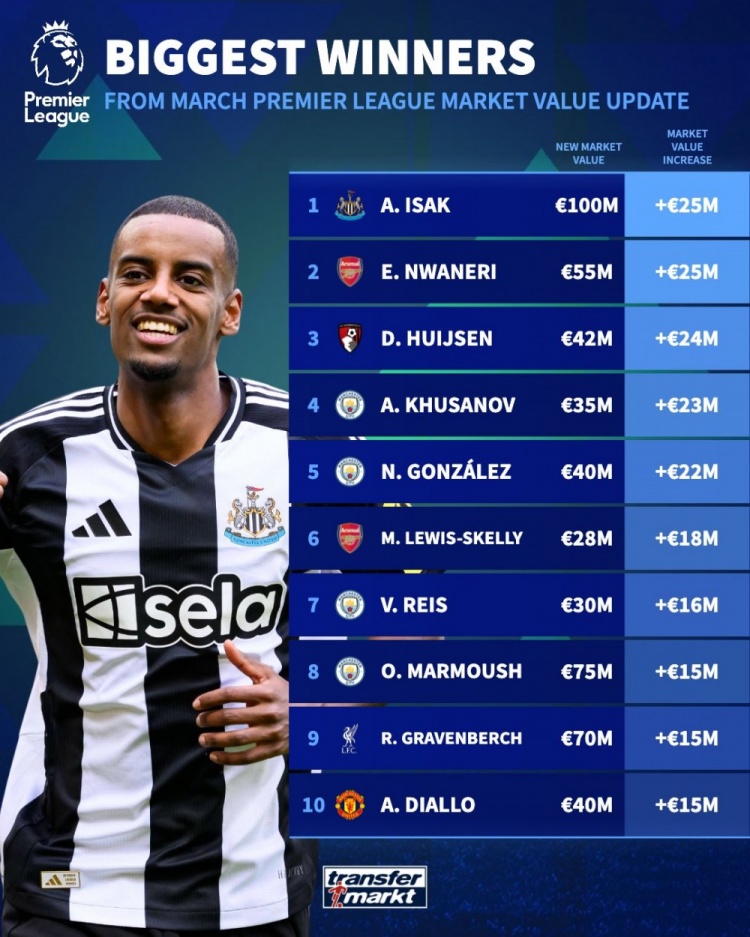 3月19日訊 《轉(zhuǎn)會(huì)市場(chǎng)》更新了英超球員身價(jià),并列出了本期球員身價(jià)上漲榜單,曼城4名新援均上榜。
