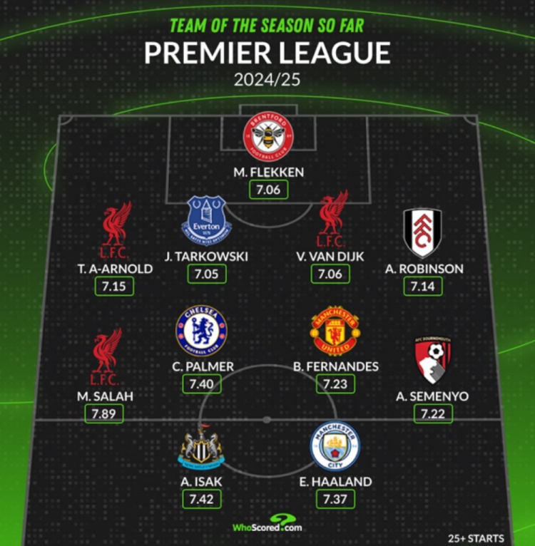 3月19日訊 數(shù)據(jù)網(wǎng)站W(wǎng)hoscored盤點(diǎn)了本賽季英超至今場均評分最高的11人陣容(至少25次首發(fā)),其中薩拉赫、哈蘭德、B費(fèi)等人在列,具體陣容如下: