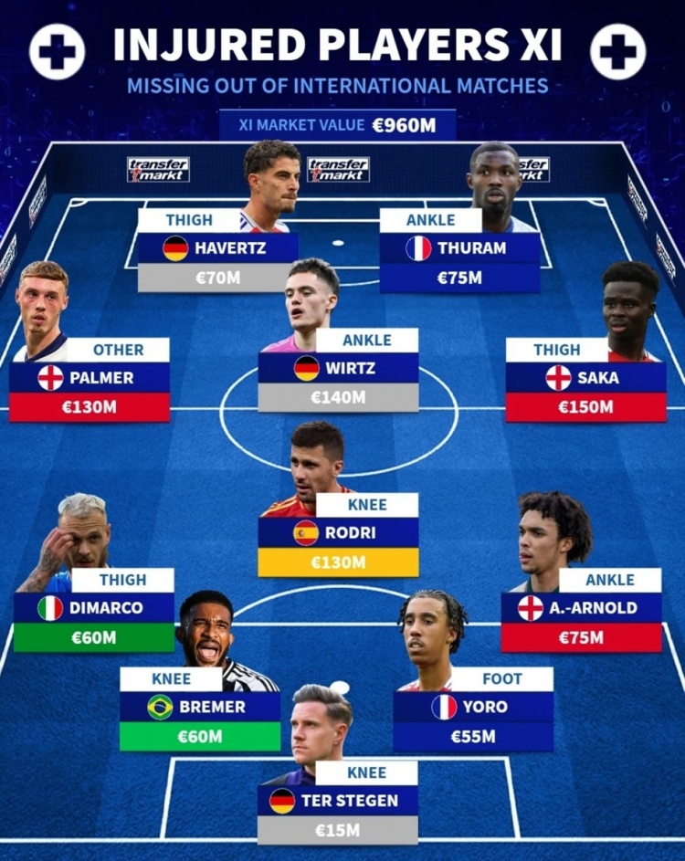 3月20日訊 德國(guó)轉(zhuǎn)會(huì)市場(chǎng)列出了因傷缺席國(guó)家隊(duì)比賽的球員陣容,薩卡、帕爾默、維爾茨、羅德里、阿諾德在列。