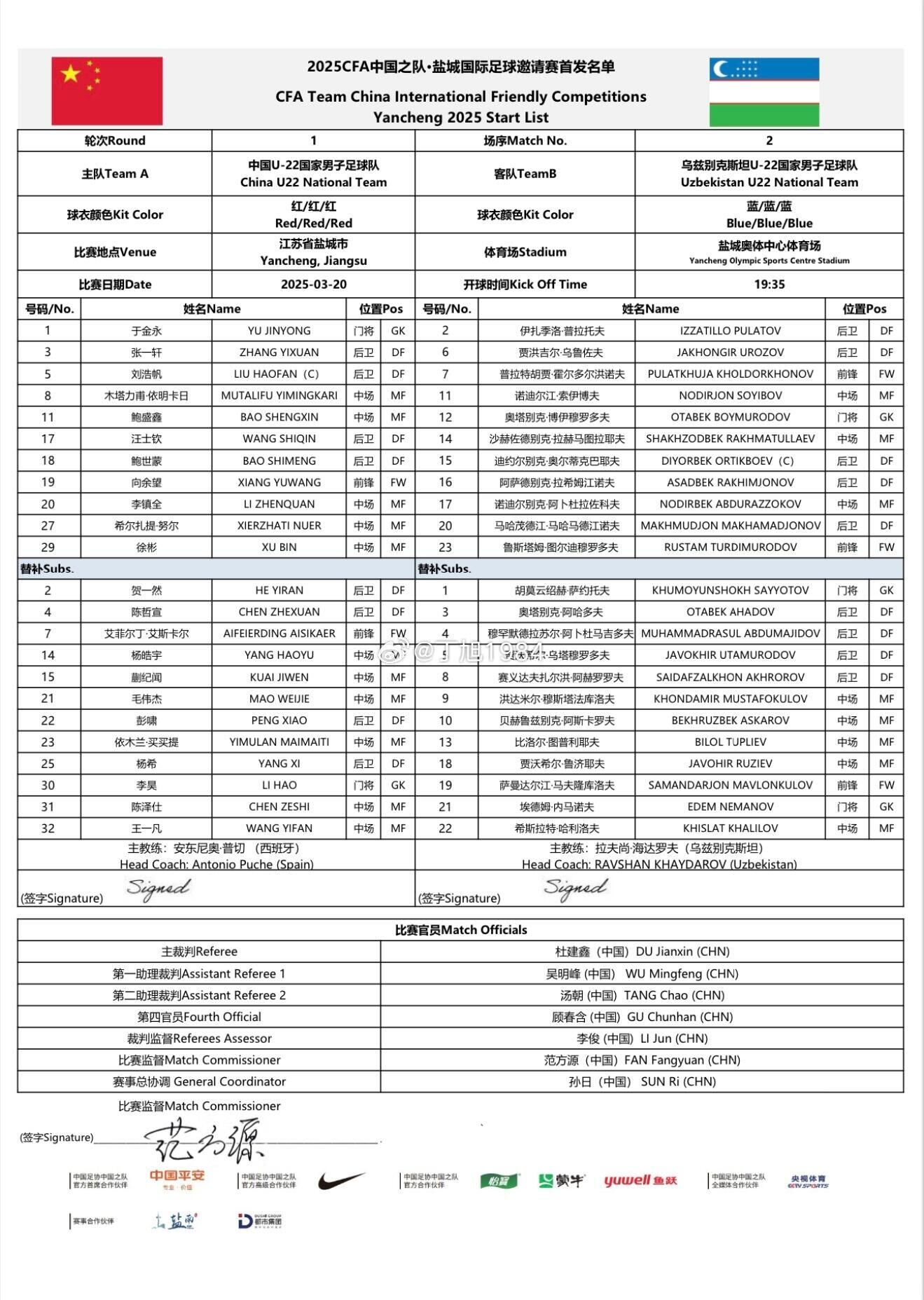 03月20日訊 2025CFA中國之隊(duì)·鹽城國際足球邀請(qǐng)賽,中國男足U22vs烏茲別克斯坦U22,賽前雙方首發(fā)公布!此前從國家隊(duì)集訓(xùn)回歸的徐彬、汪士欽、劉浩帆先發(fā)出戰(zhàn)。