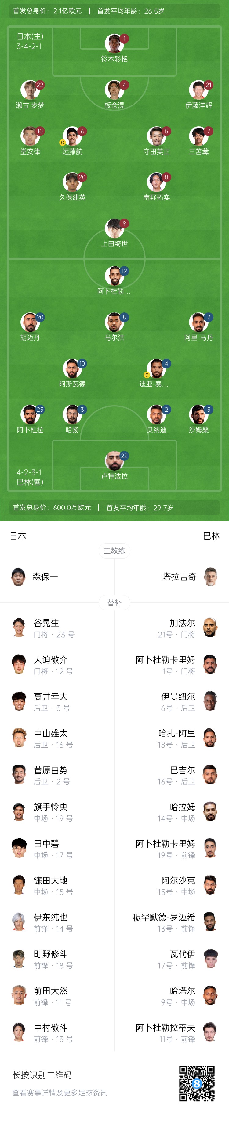 03月20日訊 北京時間18點35分,世預(yù)賽亞洲區(qū)第三階段C組第7輪,日本vs巴林,賽前雙方首發(fā)公布!本場比賽日本隊贏球即可提前晉級2026世界杯。