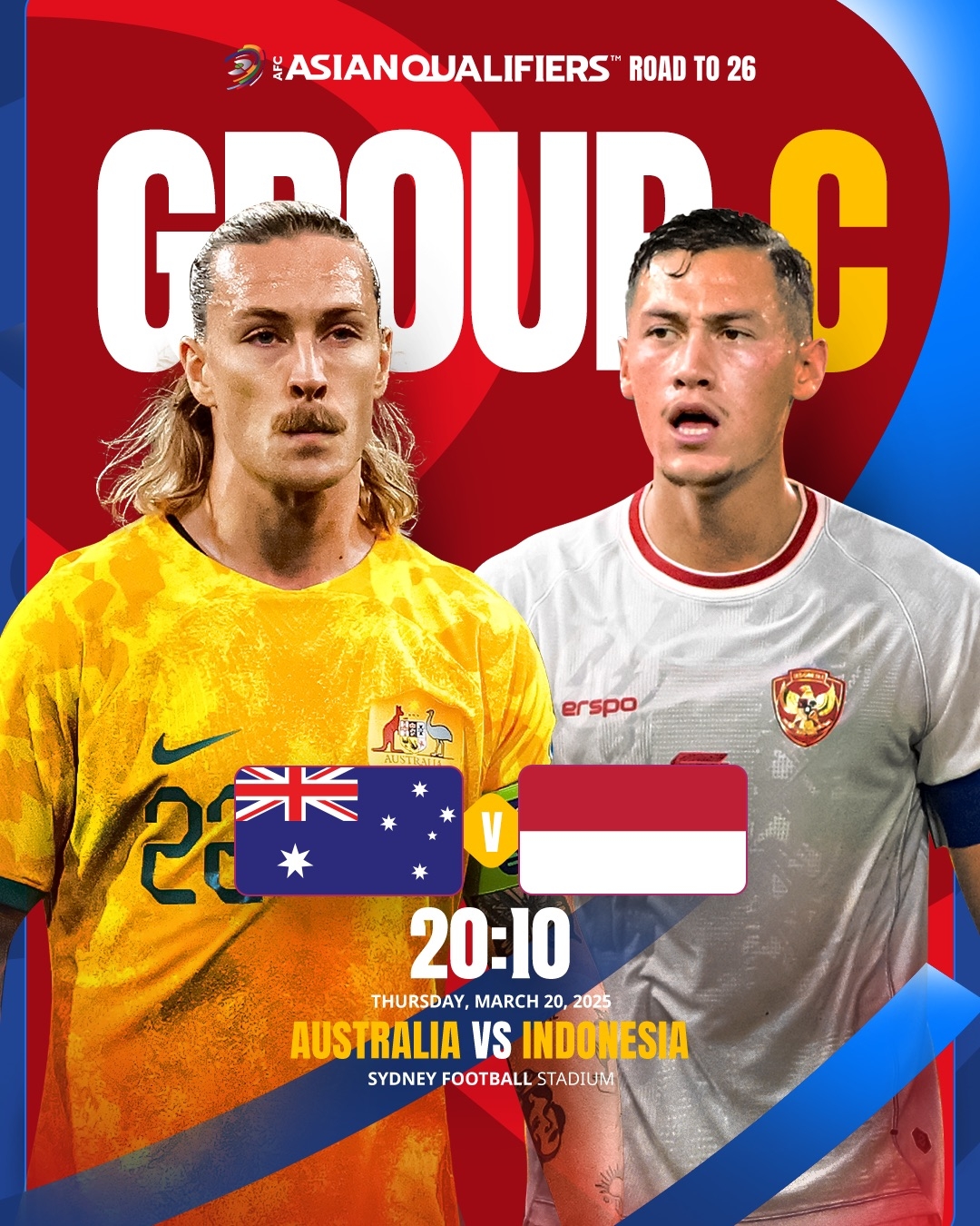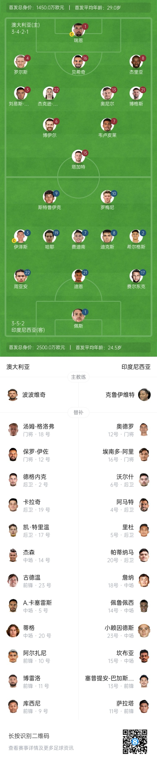 03月20日訊 北京時間今日17點10分,世預(yù)賽亞洲區(qū)第三階段C組第7輪,澳大利亞vs印尼,賽前首發(fā)陣容公布。