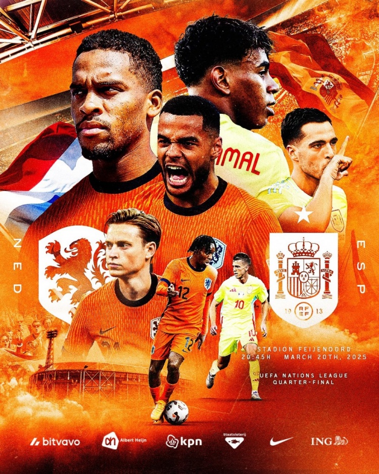 荷蘭隊(duì)官方社媒發(fā)布了為此役制作的海報(bào),加克波、尤里恩-廷伯、德容、弗林蓬、亞馬爾、奧爾莫、梅里諾出鏡。