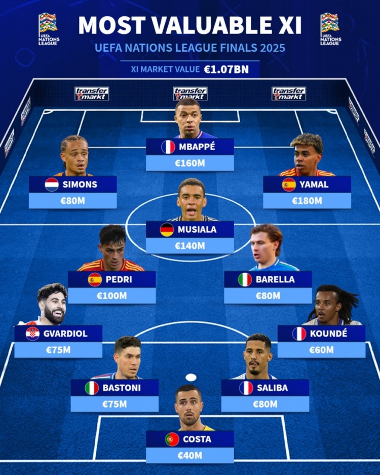 3月21日訊 德國(guó)轉(zhuǎn)會(huì)市場(chǎng)排出了歐國(guó)聯(lián)1/4決賽最貴陣容,姆巴佩、亞馬爾、穆西亞拉在列,總價(jià)10.7億歐元。