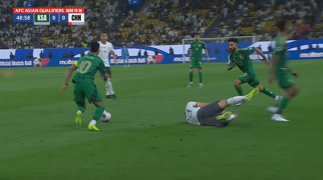 小動(dòng)作,沙特球員與張玉寧對(duì)抗后,踩了一腳倒地的張玉寧
