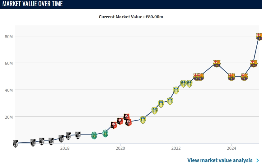 本賽季28歲的拉菲尼亞狀態(tài)優(yōu)異,各賽事42場(chǎng)比賽打進(jìn)27球,并有20次助攻,場(chǎng)均制造一球的同時(shí)也幫助巴薩多線爭(zhēng)冠,創(chuàng)造生涯最佳表現(xiàn)的他身價(jià)卻與去年12月份相同,仍為8000萬(wàn)歐元。