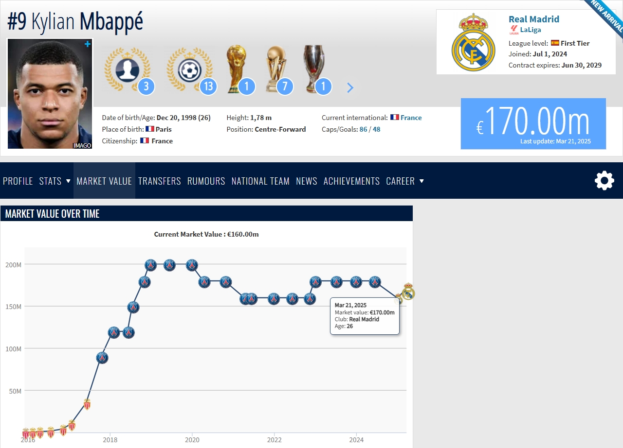 26歲姆巴佩生涯身價(jià)走勢:加盟皇馬先下跌后回漲至1.7億,巔峰2億