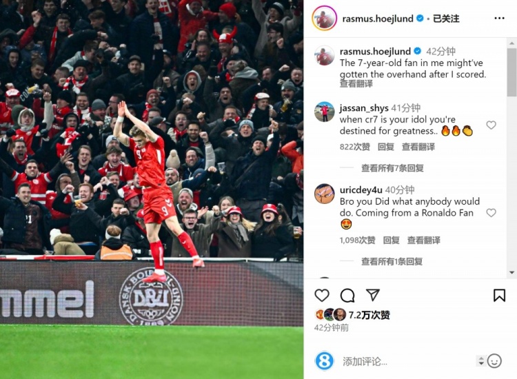 霍伊倫在社交媒體上曬出自己慶祝的照片,配文:“藏在我心里的那個(gè)7歲小球迷,進(jìn)球后可能接管了我。”
