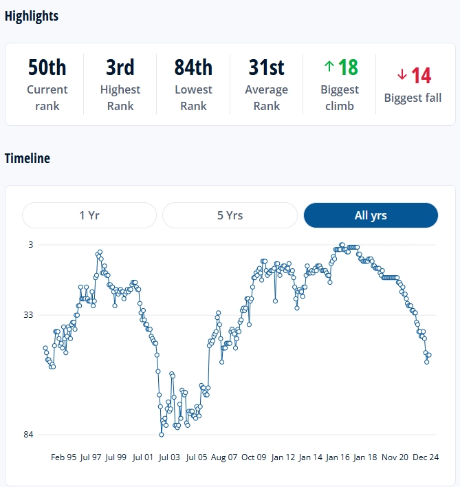 智利的FIFA排名曾在2016年達(dá)到隊(duì)史最高的第3名,從2021年開始,智利的排名就不斷下降,最低跌至過(guò)第53名,如今為第50名。
