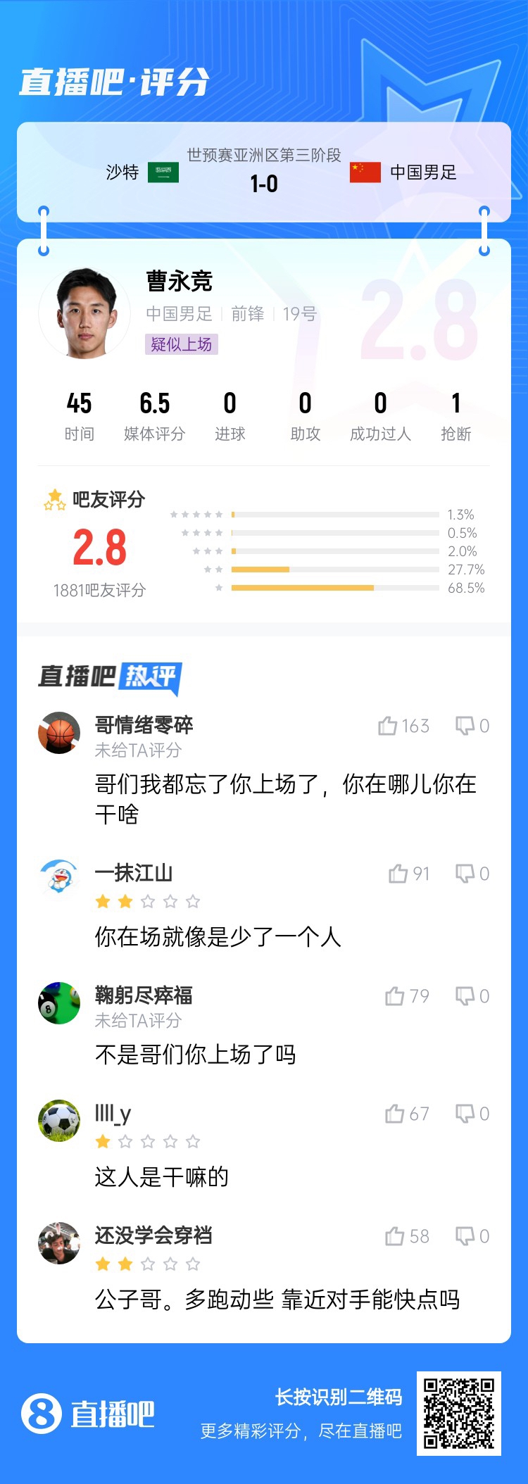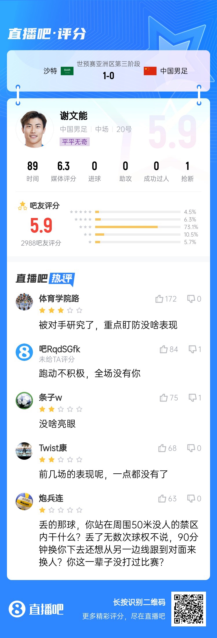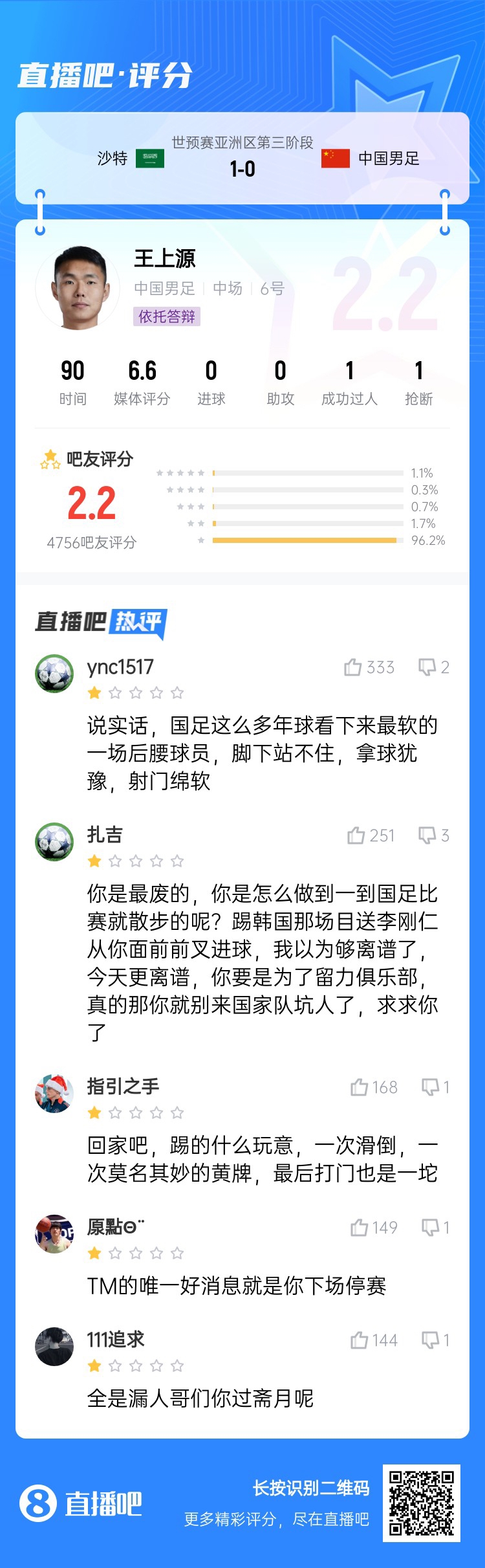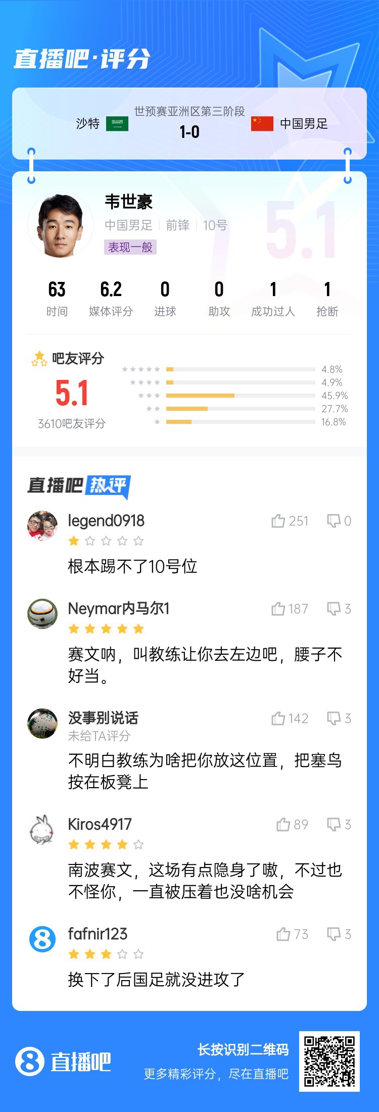 18強(qiáng)賽關(guān)鍵戰(zhàn),國足0-1不敵沙特,沒能擺脫小組墊底。吧友評分中,國足中場球員普遍低分,韋世豪5.1分,王上源2.2分,曹永競2.8分,謝文能5.9分。