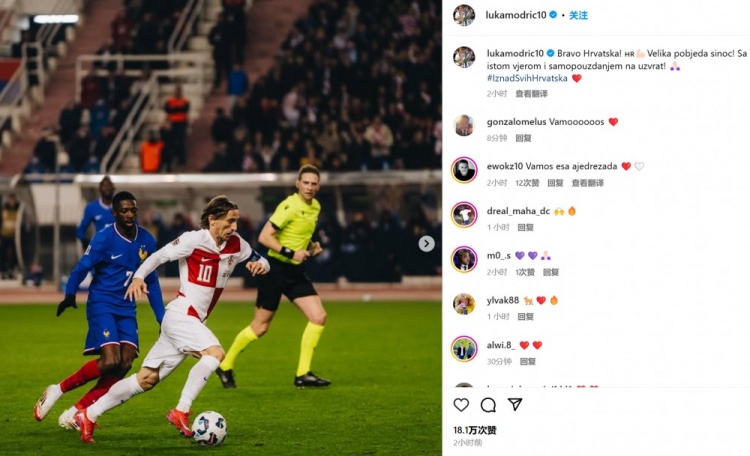 力克大熱門法國!莫德里奇社媒:次回合要保持同等信念和自信