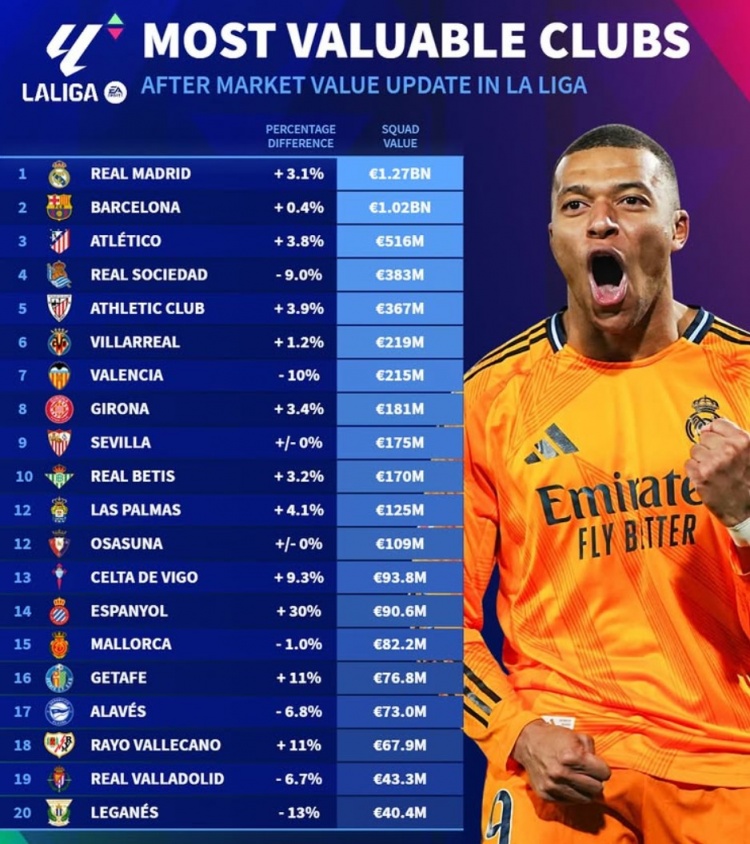 3月22日訊 《轉(zhuǎn)會市場》更新了西甲球員身價,并列出了最新的西甲球隊(duì)身價榜,皇薩競分列前三。