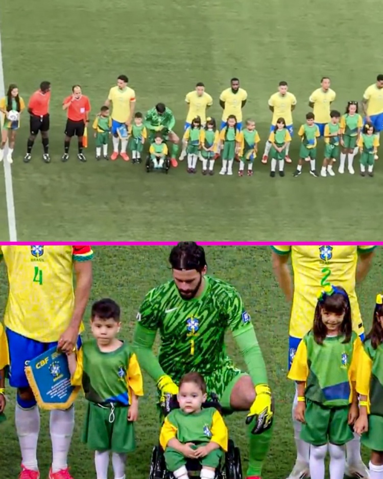 此役阿利森擔(dān)任巴西隊(duì)首發(fā)門將,他在賽前列隊(duì)奏國歌時單膝跪地,以照顧身前坐輪椅的球童,避免身高差太大。