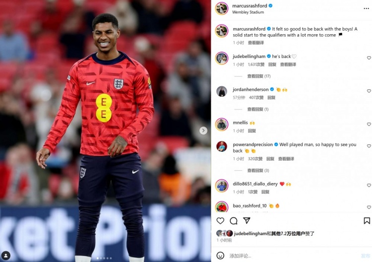 本場比賽拉什福德首發(fā)上陣,賽后他也在個(gè)人社媒曬出笑容滿面的訓(xùn)練照,配文寫道:“重回球隊(duì)并與這些隊(duì)友重聚感覺太棒了,為世預(yù)賽奠定堅(jiān)實(shí)的基礎(chǔ),后面還有更多挑戰(zhàn)!”
