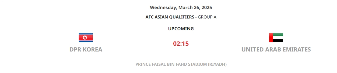 亞足聯(lián)官網(wǎng)顯示:朝鮮主場(chǎng)對(duì)陣阿聯(lián)酋的比賽,將在沙特利雅得進(jìn)行