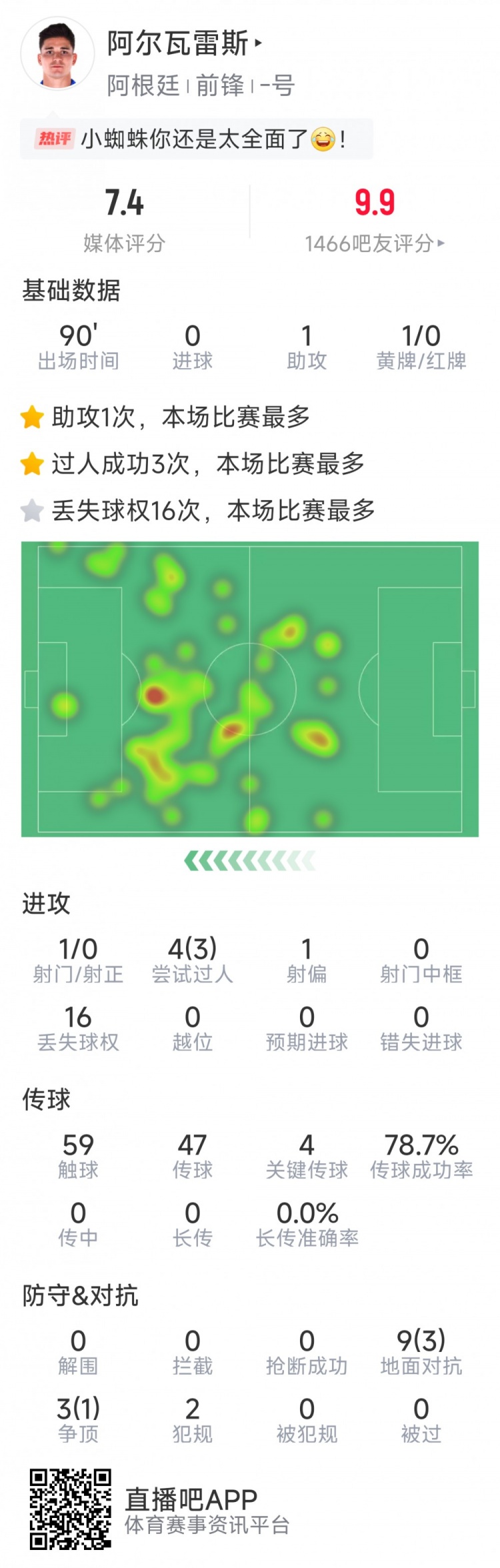 阿爾瓦雷斯本場(chǎng)數(shù)據(jù):1次助攻,4次關(guān)鍵傳球,3次成功過(guò)人