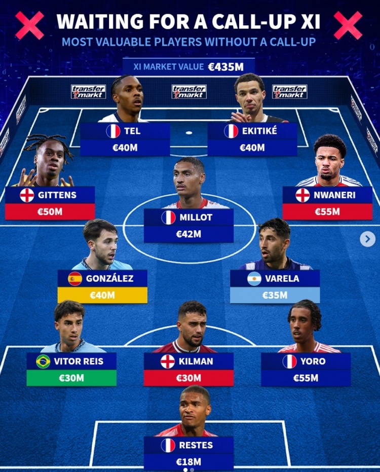 3月22日訊 本月的國家隊(duì)比賽正在進(jìn)行中,《轉(zhuǎn)會(huì)市場》也列出了仍未獲得國家隊(duì)征召的當(dāng)前最貴陣,法國5將在列。