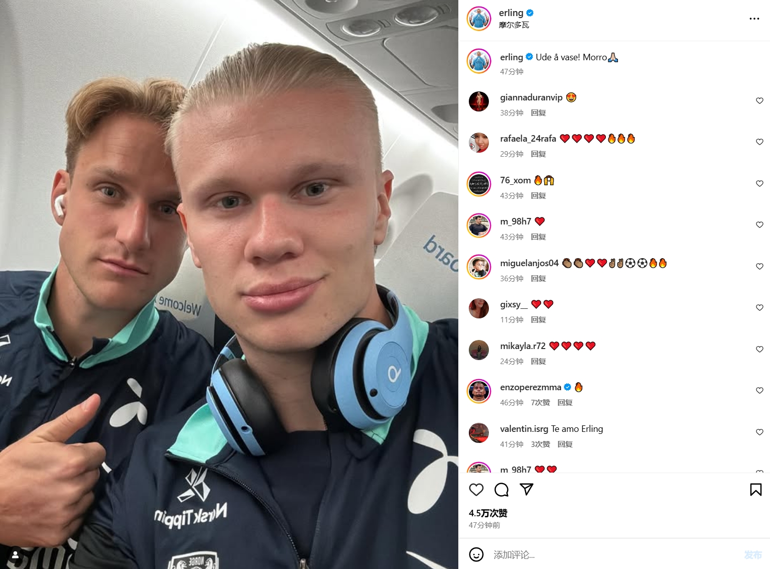 哈蘭德更新社媒動(dòng)態(tài),曬出與國(guó)家隊(duì)隊(duì)友博特海姆的合照,配文:“出去瞎逛,有趣?!?/p>