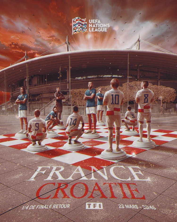 法國(guó)隊(duì)官方社媒發(fā)布了為次回合制作的海報(bào),內(nèi)容為兩隊(duì)球員在球場(chǎng)外的棋盤上對(duì)峙,姆巴佩、莫德里奇領(lǐng)銜出鏡。