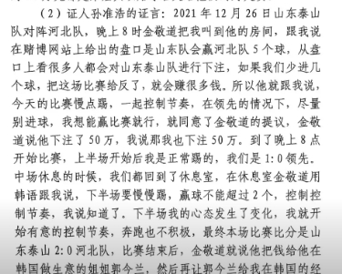 2021年12月26日山東泰山隊對陣河北隊,晚上8時金敬道把我叫到他的房間,跟我說在賭博網(wǎng)站上給出的盤口是山東隊會贏河北隊5個球,從盤口上看很多人都會對山東泰山隊進行下注,如果我們少進幾個球,把這場比賽給反了,就會賺很多錢。