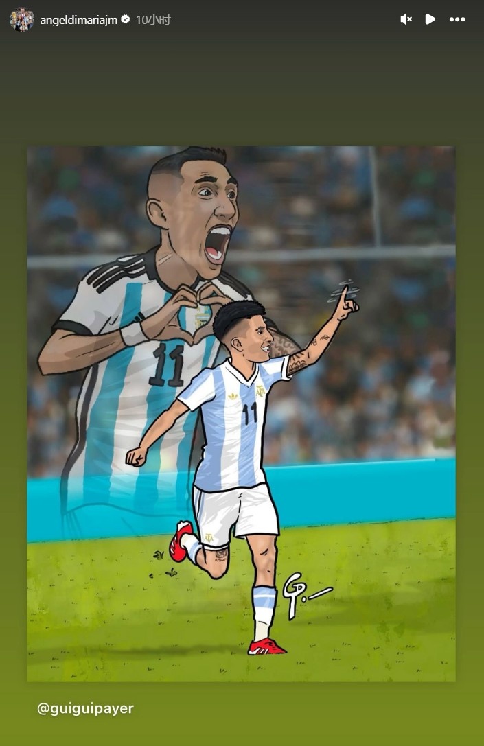 他的表現(xiàn)得到了前輩的認可,迪馬利亞轉(zhuǎn)發(fā)了一張兩人同框的漫畫海報,預(yù)示著阿根廷11號的傳承。