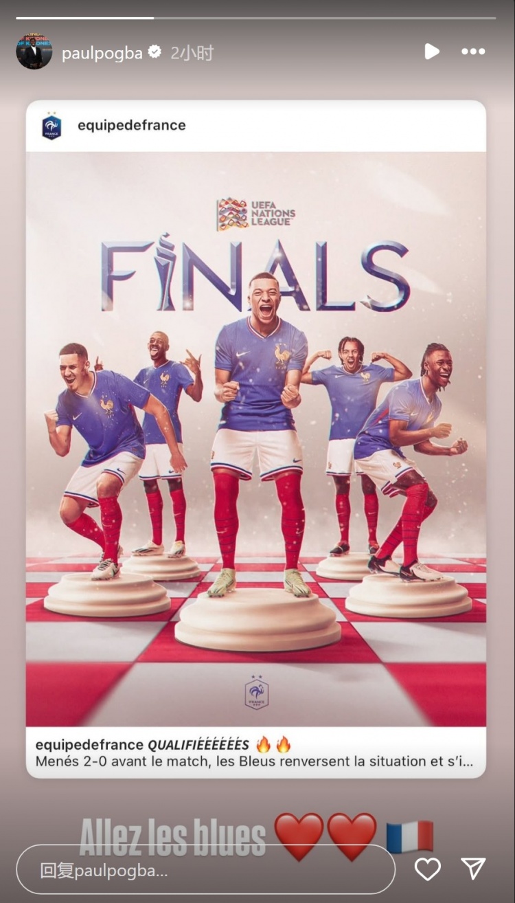 心系國家隊!博格巴社媒曬法國隊晉級海報:加油藍(lán)衣軍團(tuán)