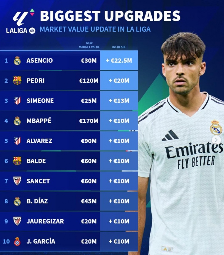 3月24日訊 《轉會市場》統(tǒng)計了西甲球員身價更新后的升值最多情況,勞爾-阿森西奧力壓佩德里居首。