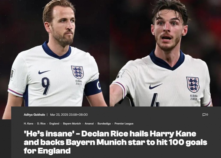 賴斯:凱恩能達成英格蘭隊百球成就,他是一名偉大的隊長