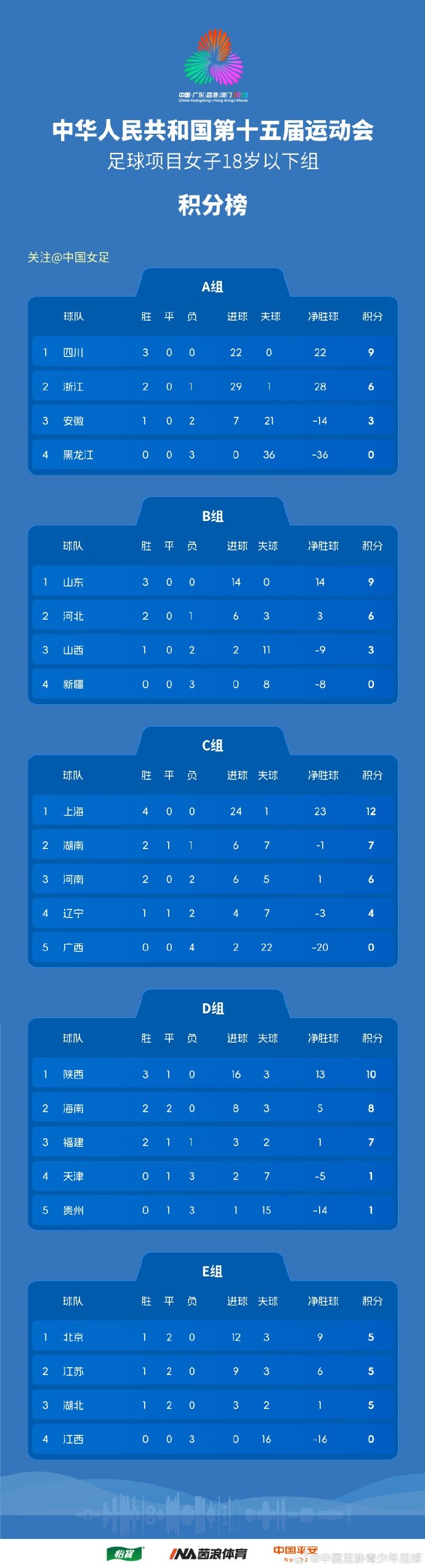 全運會女足U18資格賽(CD組)第5輪、(ABE組)第3輪賽果+積分榜