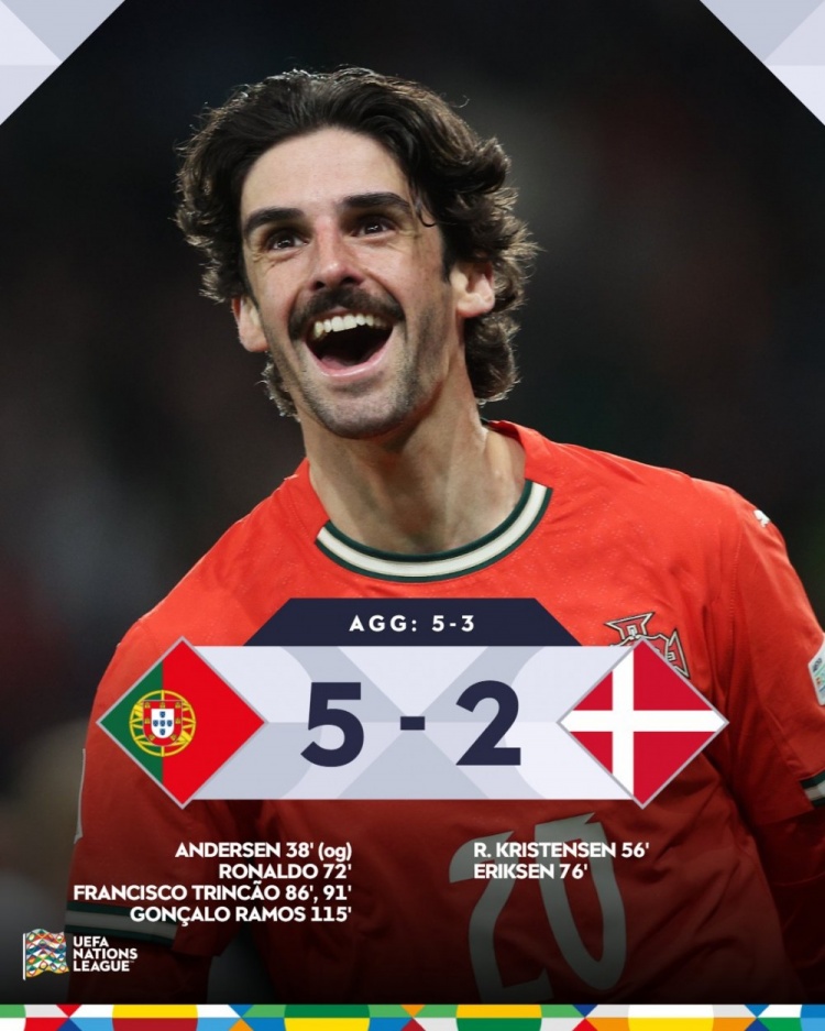 3月24日訊 歐國聯(lián)八強戰(zhàn)次回合,葡萄牙加時賽5-2擊敗丹麥,總比分5-3晉級四強,半決賽將戰(zhàn)德國。