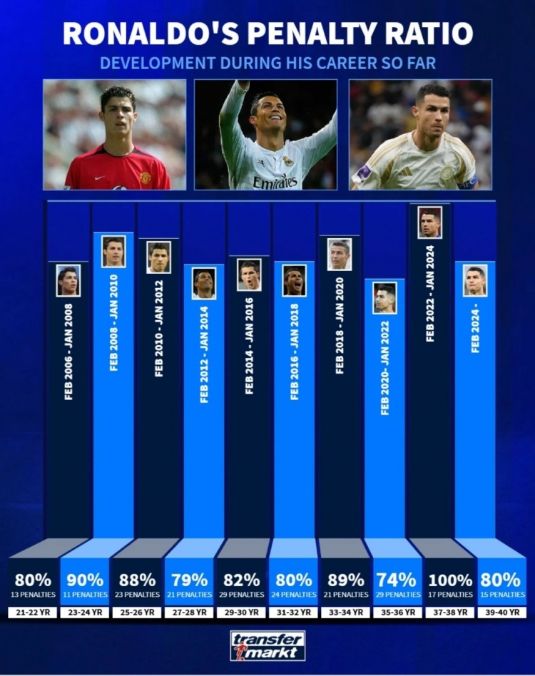 3月24日訊 德國轉(zhuǎn)會(huì)市場統(tǒng)計(jì)了C羅不同年齡段的點(diǎn)球命中率,并排出列表,C羅37到38歲點(diǎn)球命中率100%最高,39到40歲點(diǎn)球命中率80%。