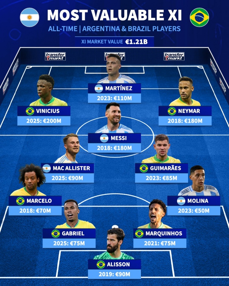 巴西+阿根廷德轉(zhuǎn)歷史最高身價(jià)陣容(總價(jià)12.1億歐)
