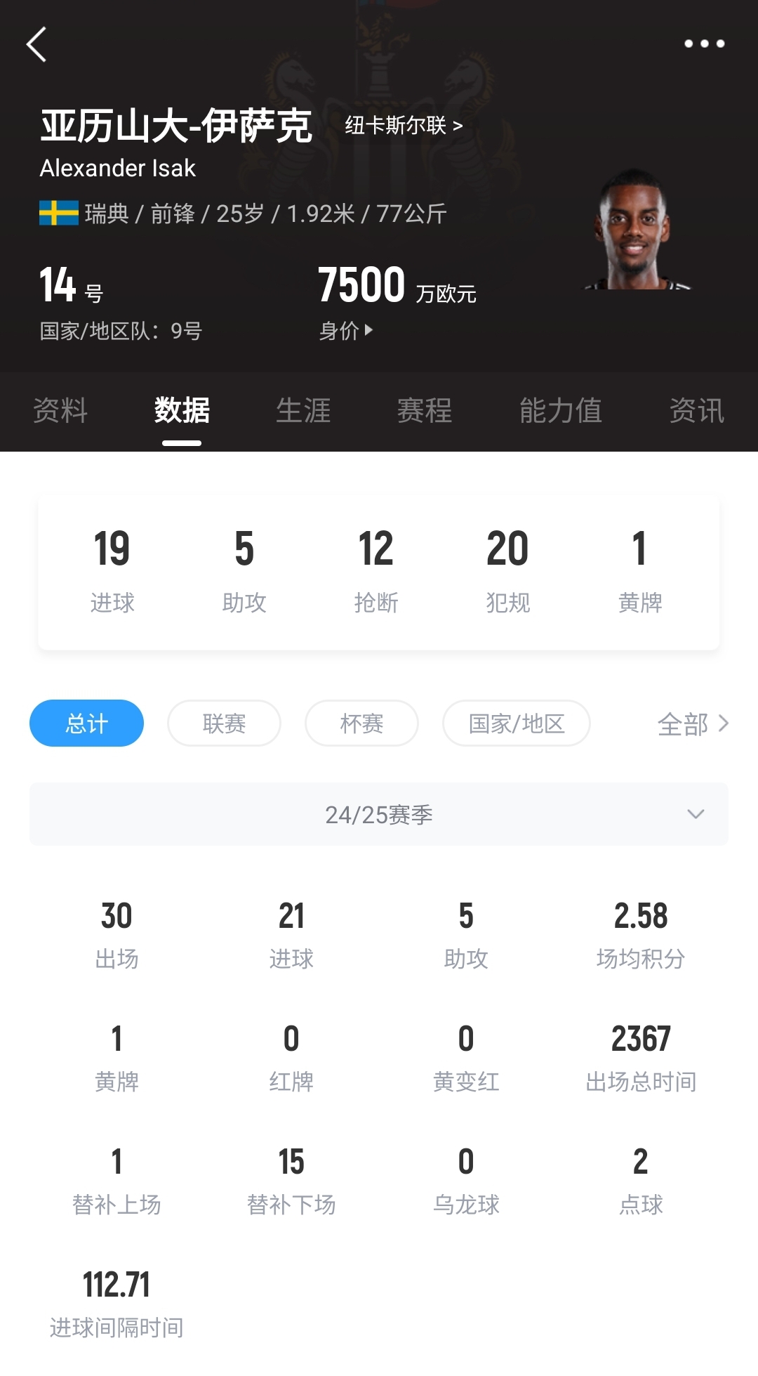 2022年夏窗紐卡花費7000萬歐簽下球員。本賽季25歲的伊薩克為紐卡出戰(zhàn)30場比賽,打進(jìn)21球并有5次助攻,目前球員德轉(zhuǎn)身價7500萬歐。