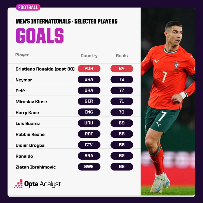 03月25日訊 在昨天結(jié)束的歐國聯(lián)1/4決賽,葡萄牙對陣丹麥的比賽中,比賽第73分鐘,C羅為葡萄牙攻入1球。據(jù)opta統(tǒng)計,30歲后C羅國家隊打入84球超眾多球星的國家隊進(jìn)球數(shù),包括巴西內(nèi)馬爾的79粒、德國隊克洛澤的71粒、英格蘭隊凱恩的70粒等。
