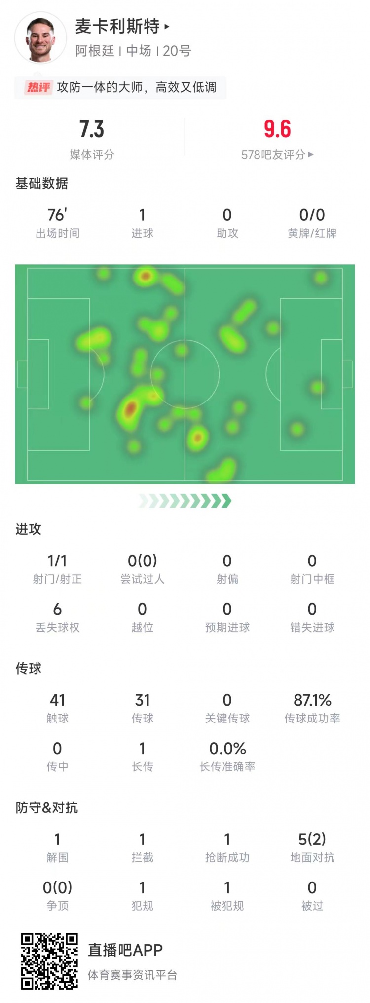 麥卡利斯特本場數(shù)據(jù):射門1次打進1球,傳球成功率87.1%&評分7.3