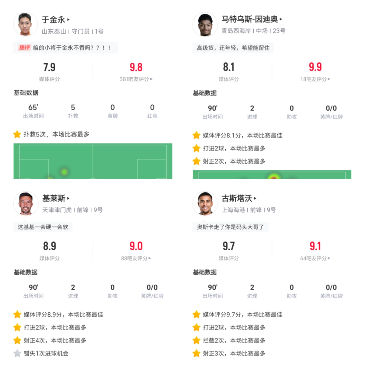 中超首輪最佳球員得票率前三: