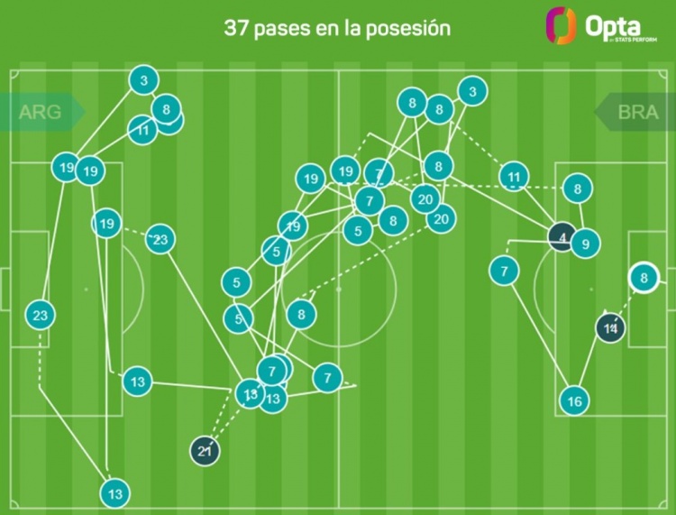 恩佐對陣巴西的進(jìn)球經(jīng)過37次連續(xù)傳球,本屆南美世預(yù)賽第二多