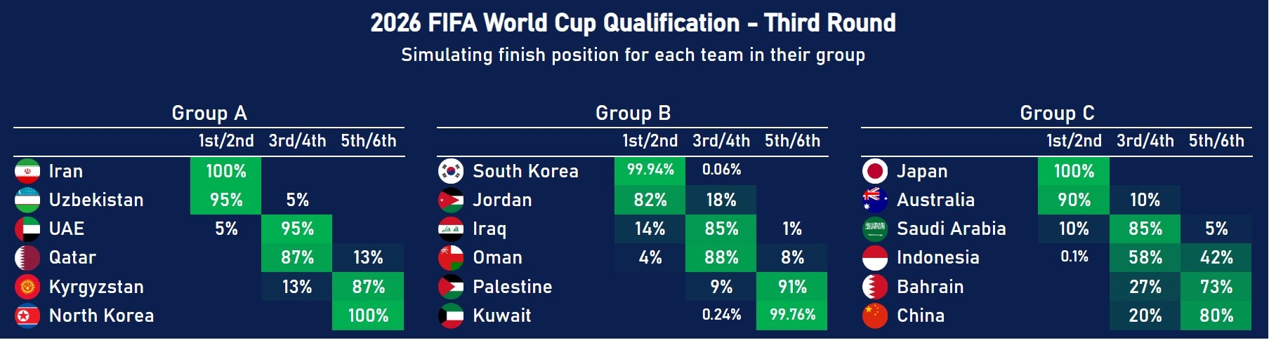其中中國隊(duì)20%排3/4(附加賽),80%排在5/6(無緣世界杯),而印尼58%概率獲得附加賽資格。