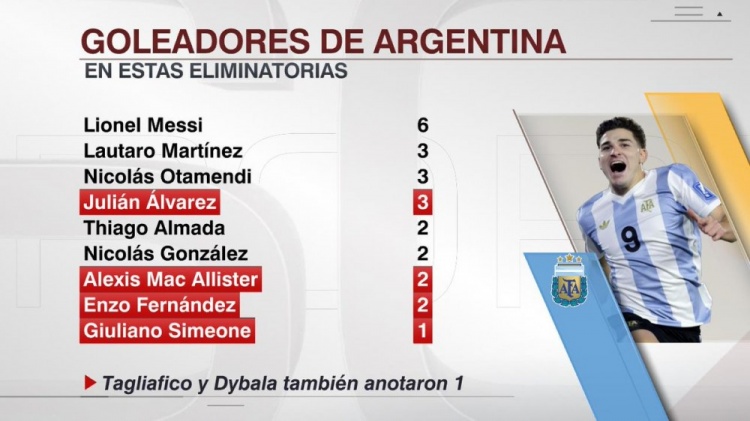 ESPN統(tǒng)計(jì)了阿根廷球員本屆世預(yù)賽的進(jìn)球數(shù)量,并列出榜單,梅西以6球居首,勞塔羅、奧塔門(mén)迪、阿爾瓦雷斯3球次席。