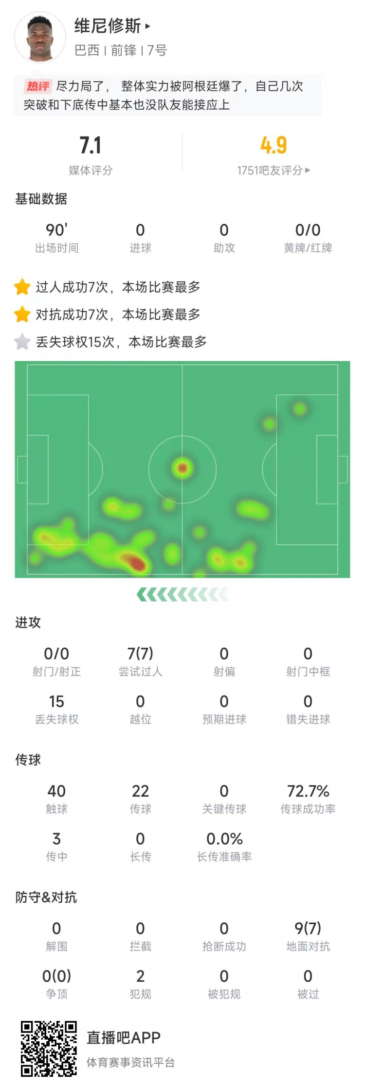 維尼修斯本場(chǎng)數(shù)據(jù):踢滿90分鐘0射門,7次成功過人全場(chǎng)最多