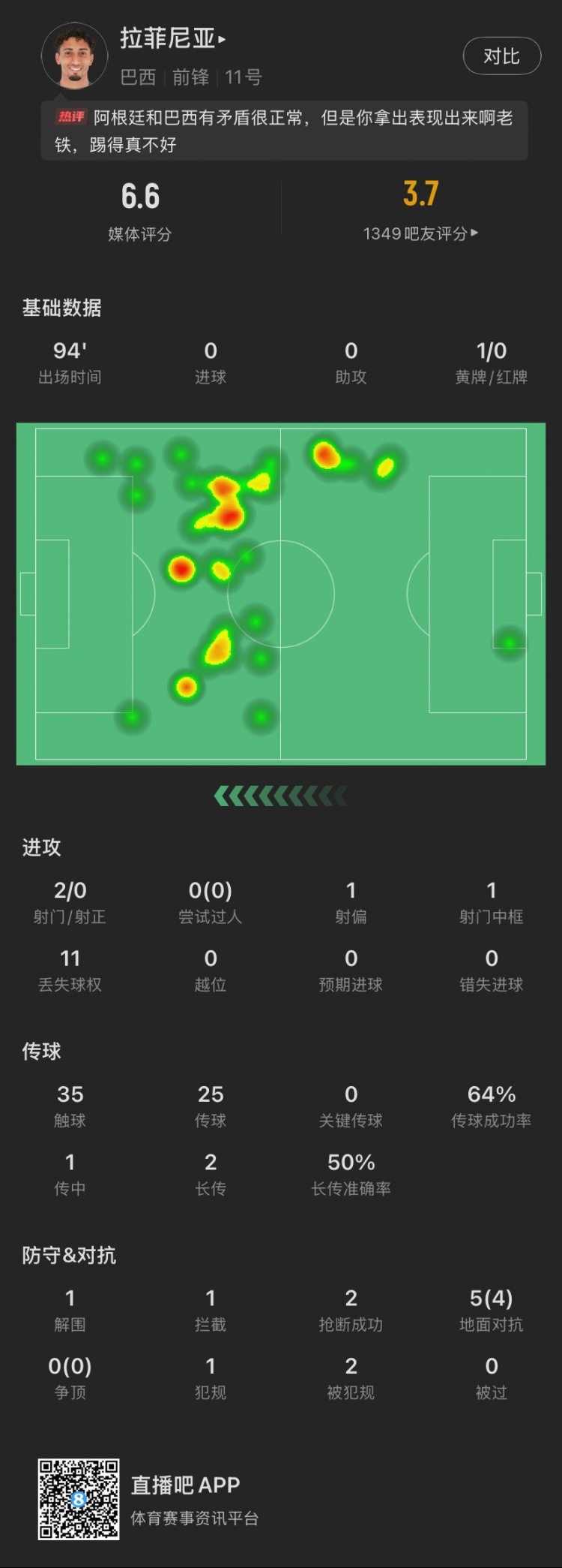 白放狠話了?拉菲尼亞本場:2射0正1中框,1黃牌,5次對(duì)抗成功4次