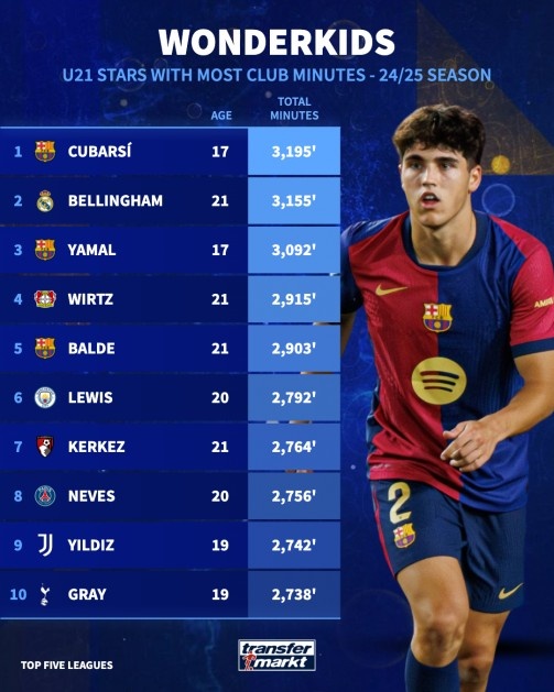 3月26日訊 根據德轉統(tǒng)計,庫巴西是本賽季出場時間最多的U21球員,達到3195分鐘,貝林厄姆、亞馬爾分居二三位。