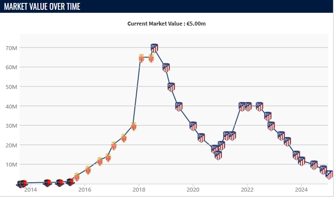但在高價(jià)加盟馬競(jìng)之后,勒馬爾的效率直線(xiàn)下滑,他也頻繁受到傷病困擾,身價(jià)一路走低,從巔峰時(shí)期的7000萬(wàn)歐,掉到現(xiàn)在的500萬(wàn)。