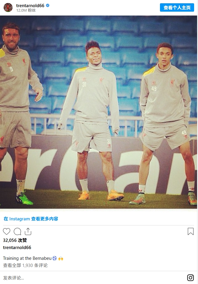 這是阿諾德首次從伯納烏的球員通道走出,他毫不猶豫在INS上發(fā)布了和斯特林以及蘭伯特在一起的照片并配文道:在伯納烏進(jìn)行訓(xùn)練。
