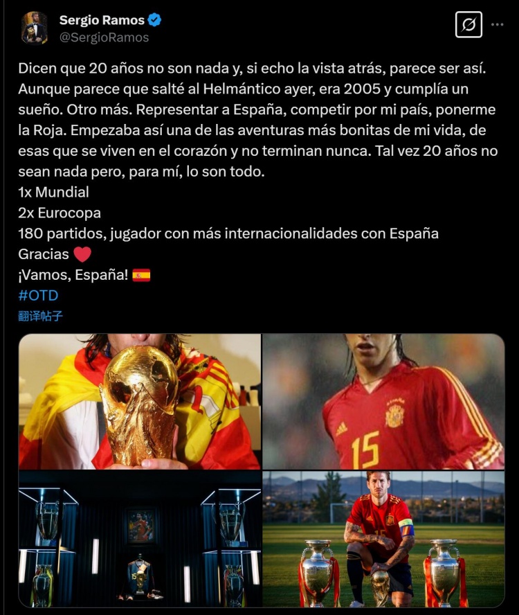 拉莫斯更新社媒,慶祝他代表西班牙國家隊首秀20周年